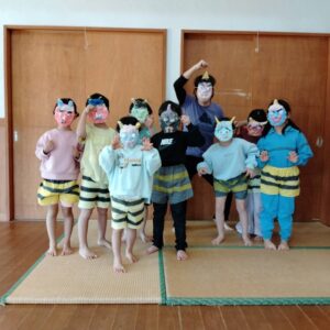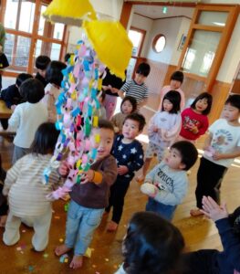 くす玉割りをしたり、年長さんが鬼となって他のクラスのところへ行き、豆まきをしました。