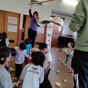 小さいくらすの子は、豆のかわりに丸めた紙をなげました。